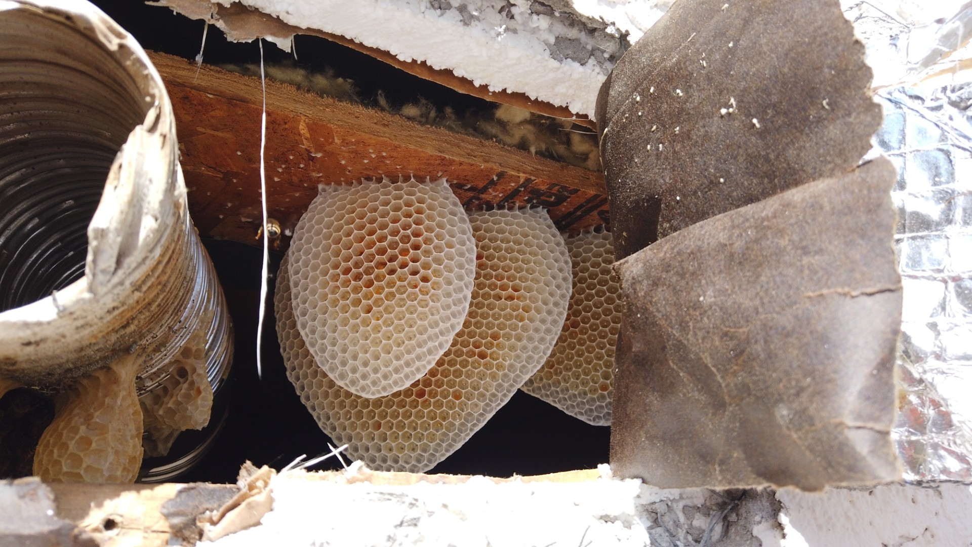 Fourth - leaving comb behind in a wall, under a floor, or in a ceiling etc is generally not a good idea. It may be ok under certain circumstances but those circumstances need to be identified. You see, comb contains nectar and honey which can melt at the next summer heat wave and cause all sorts of damage to personal property and structures. Honey dripping down drywall from the back side can create a lot of damage in homes, particularly around window casings. In addition to that, the bee eggs, larvae, and pupae that are in the comb are food for and entice cockroaches, ants, crickets, and mice to the area en masse. This in turn can create it's own problems and possibility for property damage. Not good.